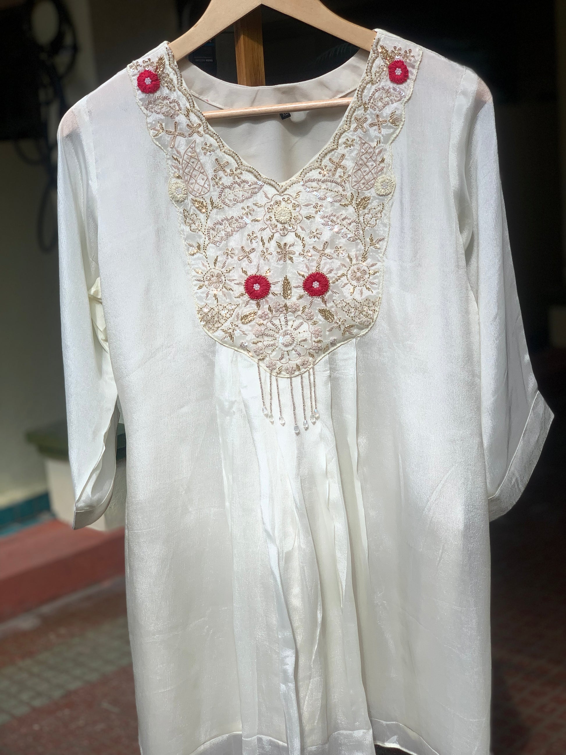 ✨ Full kardana & sequin handwork on the neck with chic moti latkans, paired with flared palazzos for that flowy finesse.