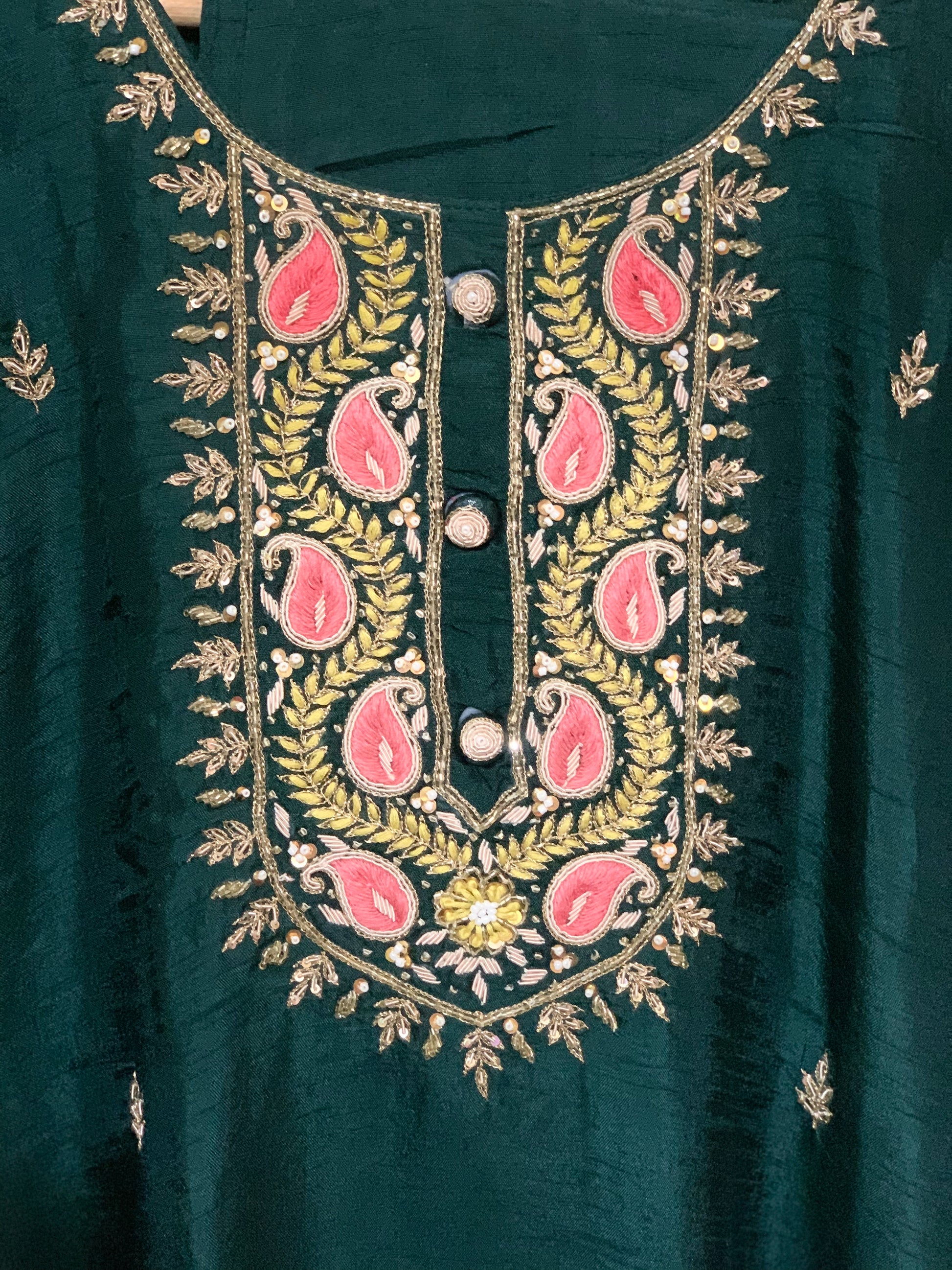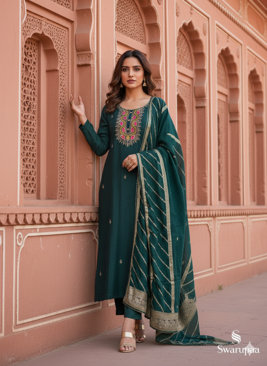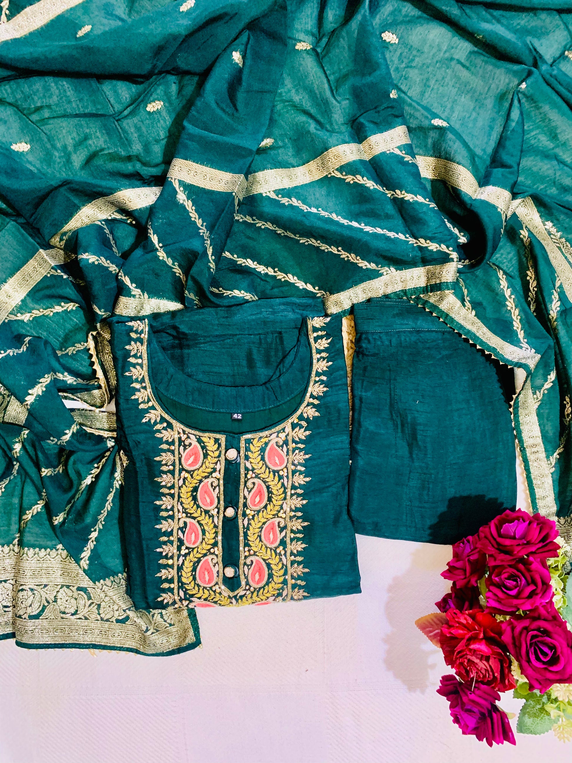 A deep green hue that whispers sophistication, zardoshi handwork that glimmers with heritage, and a Banarasi woven dupatta that completes your festive story. π