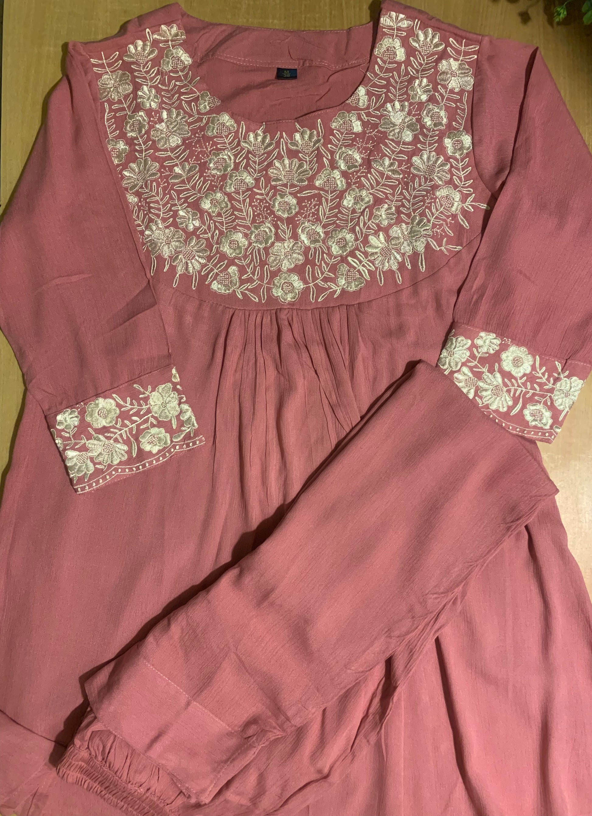 Crafted in an ultra-light, breathable fabric, this set feels soft as a feather—so airy and gentle on the skin, it’s almost like wearing nothing at all. The beautifully flared peplum silhouette adds a graceful charm, while the delicate white floral thread embroidery on the neckline and sleeves brings a premium handcrafted finish.